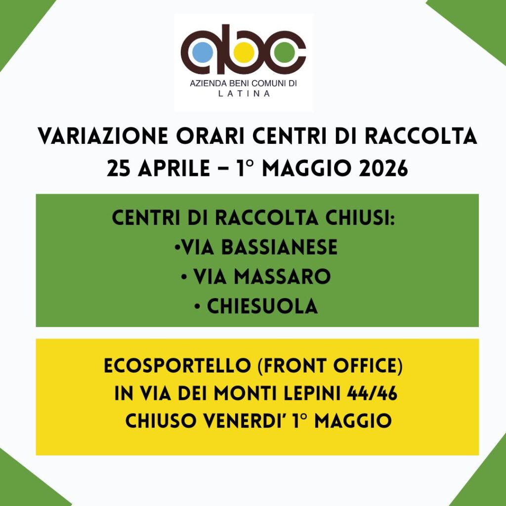 L’Azienda per i Beni Comuni di Latina informa gli utenti che, in occasione della Festa della Liberazione e della Festa dei Lavoratori, i servizi subiranno le seguenti modifiche: